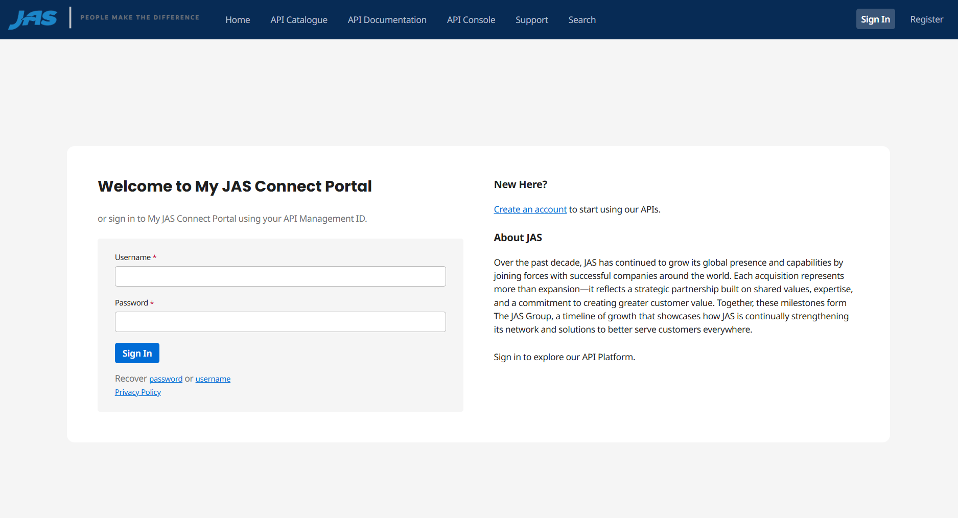 To use the REST API products offered by JAS, you will need to register as a user on the My JAS Connect portal via the Registration Form.